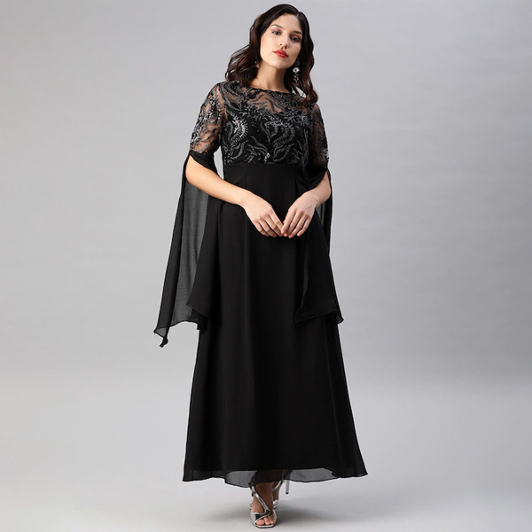 Black Embellished Slit Sleeves Maxi Dress