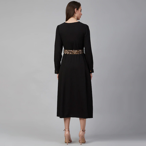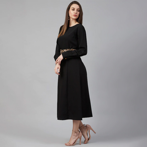Black solid woven maxi dress, has a round neck, long sleeves, and flared hem Comes with a belt