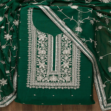 Green and silver-toned embroidered unstitched dress material