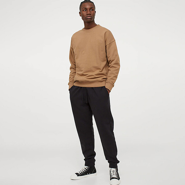 Joggers in sweatshirt fabric made from a cotton blend. Covered elastication and a drawstring at the waist, pockets in the side seams and ribbed hems. Soft brushed inside.