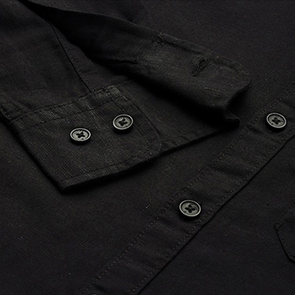 Black solid casual shirt, has a spread collar, long sleeves, button placket, curved hem, and 1 patch pocke