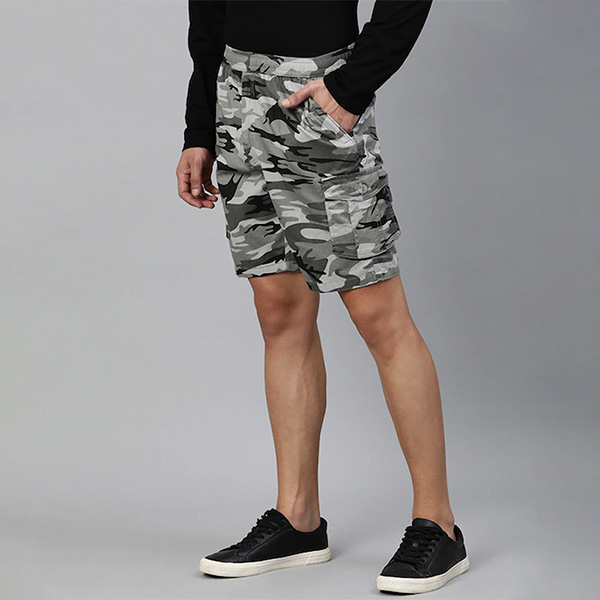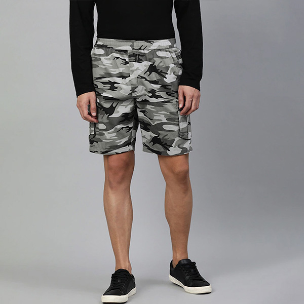 Men Charcoal Grey Camouflage Printed Pure Cotton Cargo Shorts
