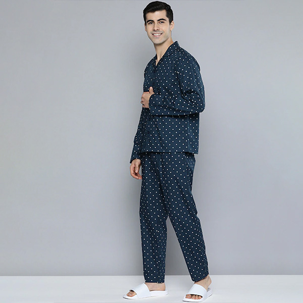 Men Navy Blue & White Printed Pure Cotton Night suit