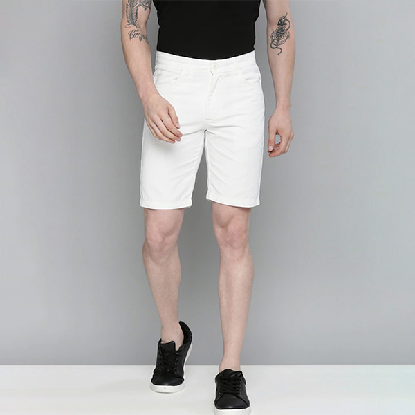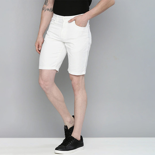 White solid mid-rise shorts, has 5 pockets, zip closure