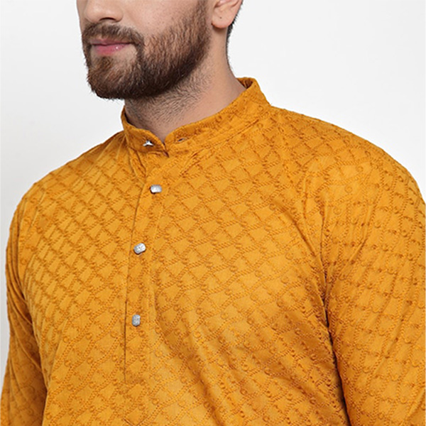 Yellow printed straight kurta, has a mandarin collar, long sleeves, straight hem, and side slits