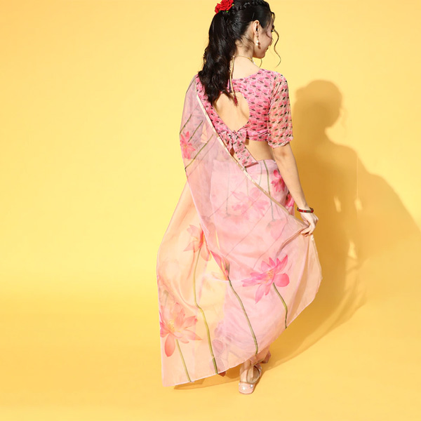Dress up or dress down this modish saree for any ethnic function. It includes a captivating organza blouse and fabric to add a touch of charm to your appearance. Pretty pink shade printed saree, Organza blouse, Organza, dry clean. The saree comes with an unstitched blouse piece The blouse worn by the model might be for modelling purpose only. Check the image of the blouse piece to understand how the actual blouse piece looks like. Trend Alert : Symbols of freshness and beauty, romantic florals in vibrant hues are blended with flowy silhouettes and ethnic motifs to create fashionable yet comfy ensembles. Featuring exaggerated silhouettes, chic frills, ruffles, floral patterns, exquisite sheer detailing, romantic florals are the epitome of youthful beauty
