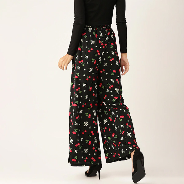 Women Black & Red Cherry Print Wide Leg Palazzos