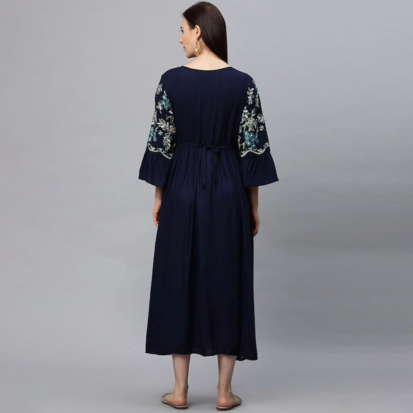 Women Navy Blue Embroidered Maternity Feeding Maxi Nursing Dress