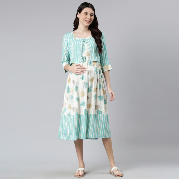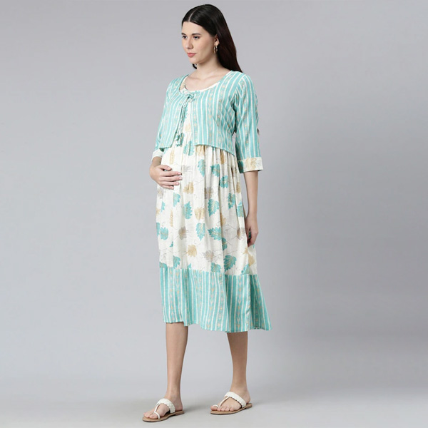 Women Off White & Green Floral Maternity A-Line Midi Dress
