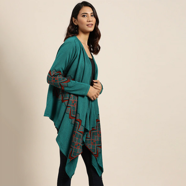 Women Teal Green & Black Geometric Patterned Longline Waterfall Shrug